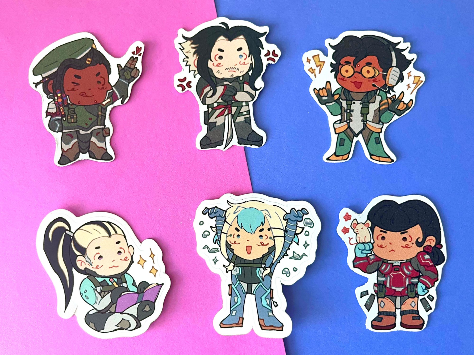 2 x 2 inch stickers featuring characters from Warframe's Hex faction, each waiting to go home with their Drifter.