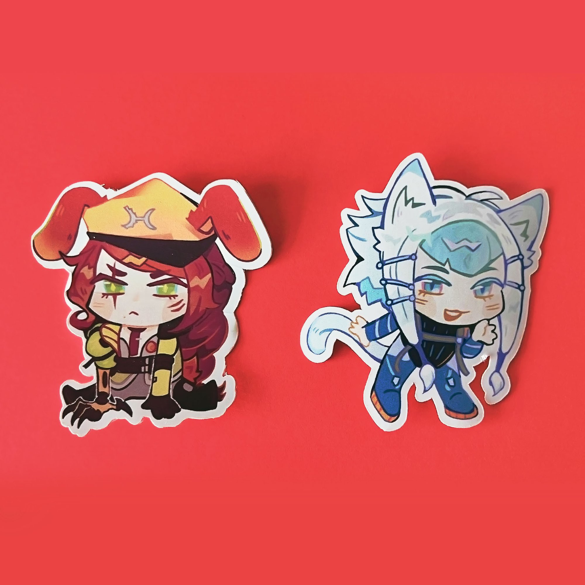 2 x 2 inch stickers featuring Aoi Morohoshi and Neci Rusalka from Warframe, being very small and whatnot.